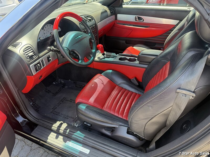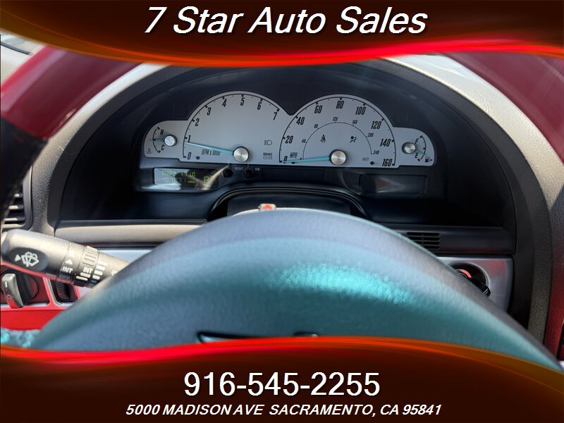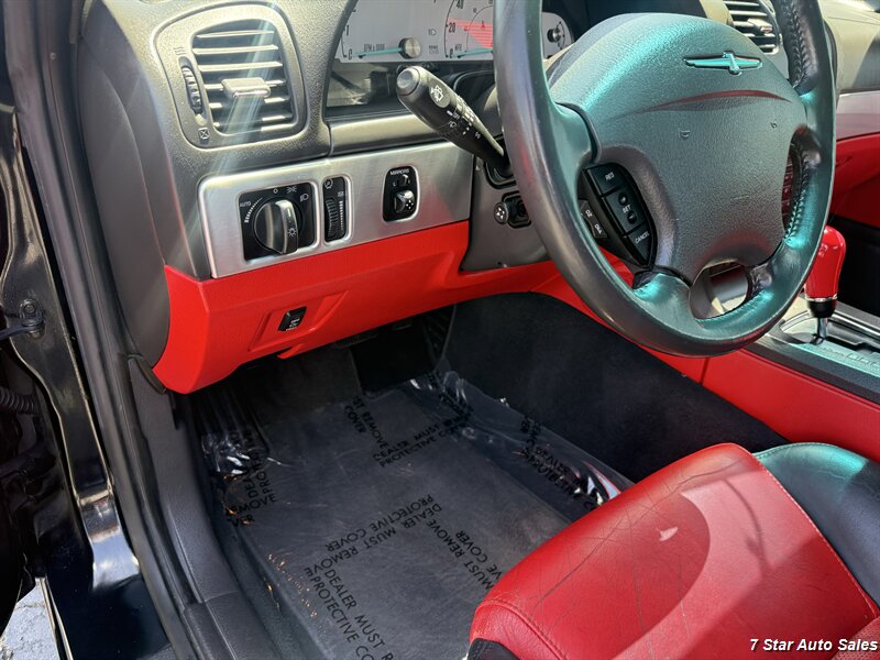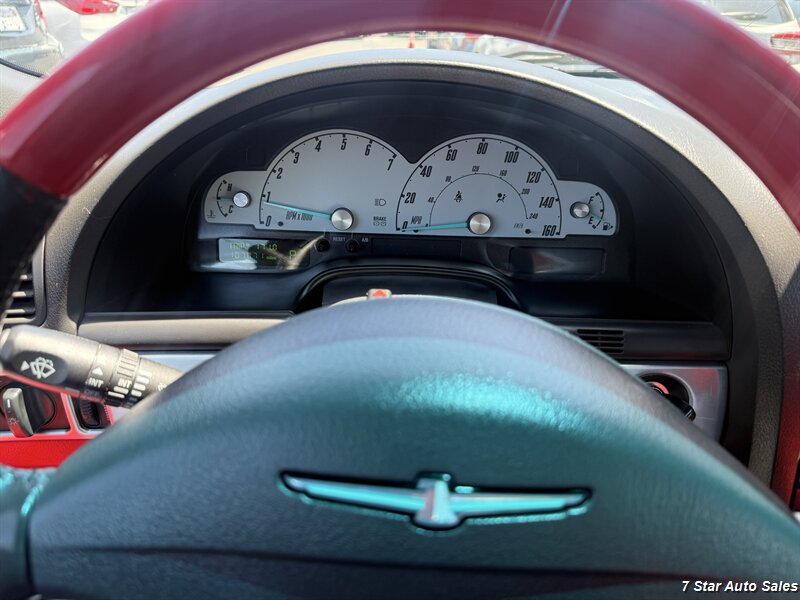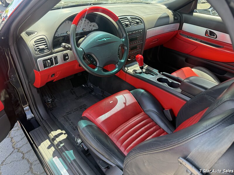Meet the 2002 Ford Thunderbird Deluxe — Evening Black on the outside, Torch Red leather on the inside, and enough V8 growl to make pigeons nervous. Under the hood is the honest 3.9L V8 putting out 252 hp and 267 ft-lbs of torque, paired to a smooth automatic that loves open roads and weekend escapes. Mileage is excellent — under 107,000 miles total (that’s less than 5,000 miles per year on average) — and the CARFAX is squeaky-clean with just one prior owner. Fuel economy: a dignified 15 MPG city and 22 MPG highway.
